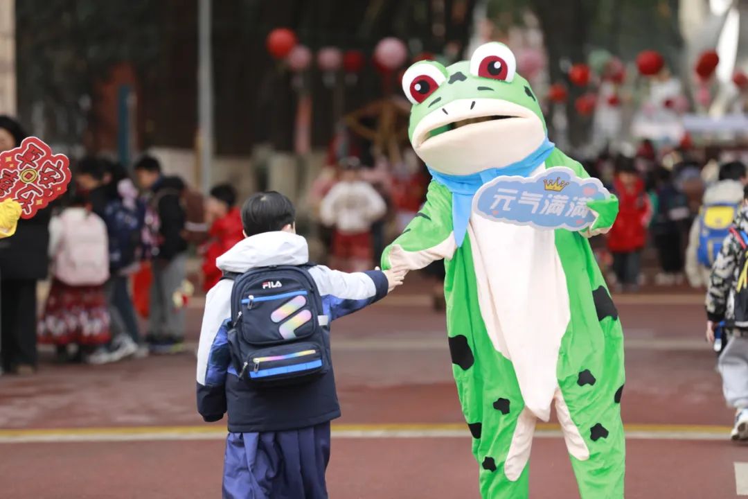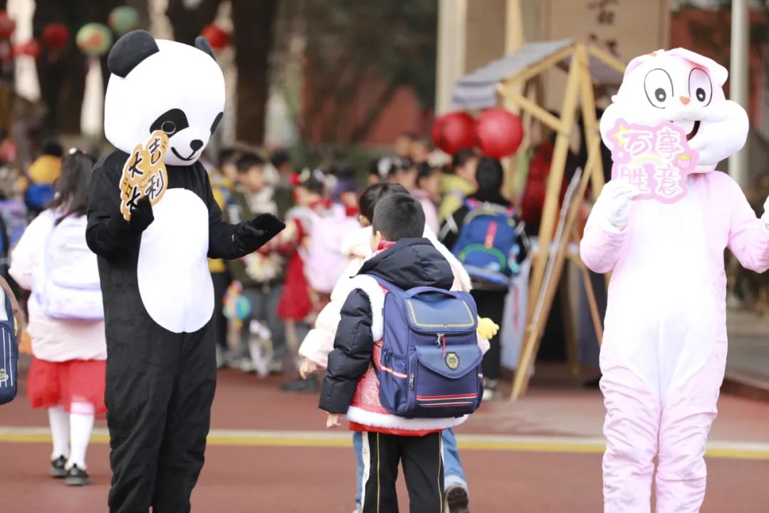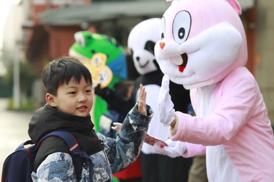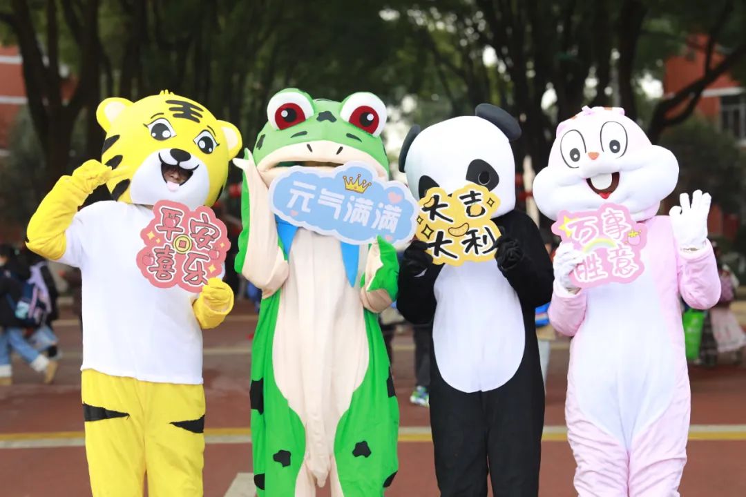当报到日遇上元宵节,校园里热闹非凡!瞧,可爱的动物人偶早已在校门口热情迎接小梅花们的到来!