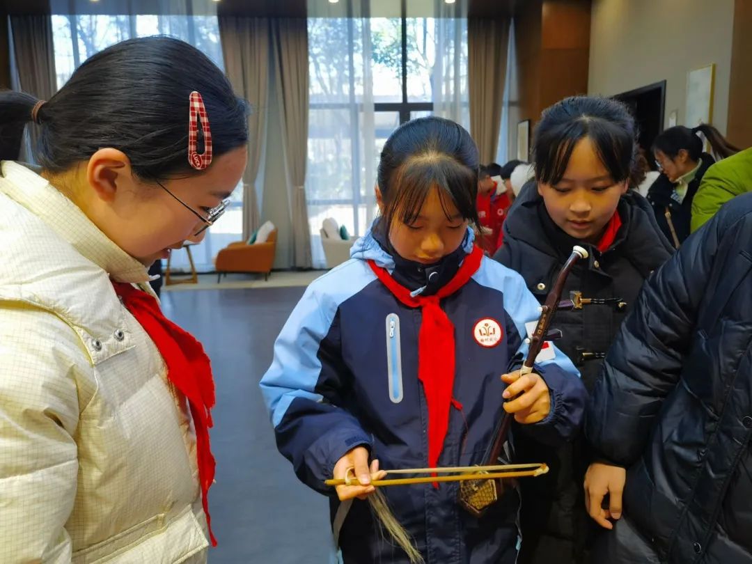 讲解员老师向队员们说到,二胡音域广泛,音色深情动人,常用于民间音乐、戏曲、交响乐等各类演出。《二泉映月》《赛马》《光明行》都是著名的二胡曲目。队员们纷纷拿起二胡,迫不及待亲身体验一下它的独特魅力。