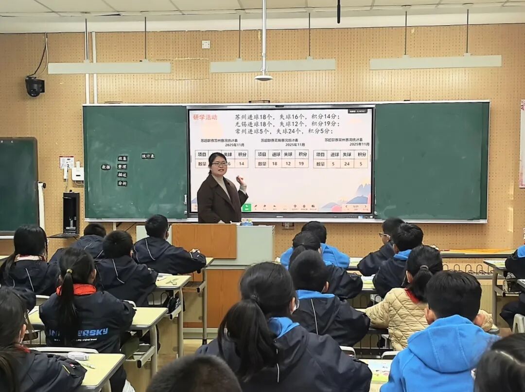 梅村实小的何浔老师执教《复式统计表》一课,她从“足球比赛进球数”的真实情境切入,当三张单式统计表同时呈现,学生在回答“哪个城市进球多”“一共进了几个”的过程中,自然产生了合并表格的需求。课堂通过动手拼接活动,巧妙地将表头设计、信息整合等难点转化为“找茬游戏”。最后“网购选店铺”的拓展环节,引导学生综合多维度数据做出决策,使数据分析意识切实落地。